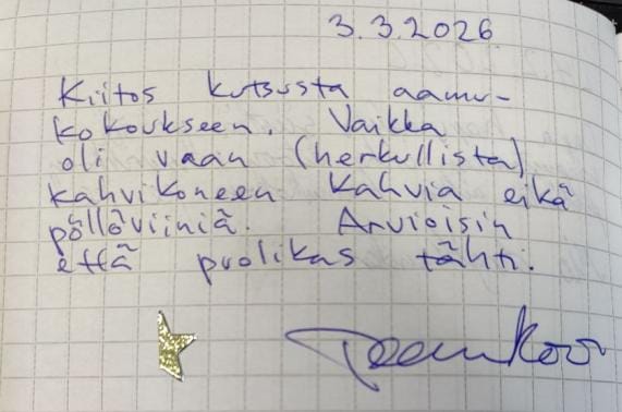 "Nyt lähiaikoina katsoin firman perustamiseen liittyviä juttuja, mitkä on sellasta munkkilatinaa tavalliselle ihmiselle niin siitä sai sitten jotain tolkkua tekoälyn avulla. Ehkä jos jotain tällaisella vähäisellä kokemuksella voi neuvoa, niin kannattaa käyttää sitä sellaisiin juttuihin, missä keskitason suoritus on itselleen tyydyttävä, mutta ei sellasiin asioihin mitkä haluaa, että menee tosi hyvin. Sen verran pitää olla itsekunnioitusta ja kunnianhimoa, että luottaa että ite pystyisi kuitenkin tekemään paremmin vaikka sitten käyttäisi jotain generatiivista tekoälyä jonkun asian miettimiseen. Tai niinku muistaa, että oma näkemys on se arvokkain asia siinä."
